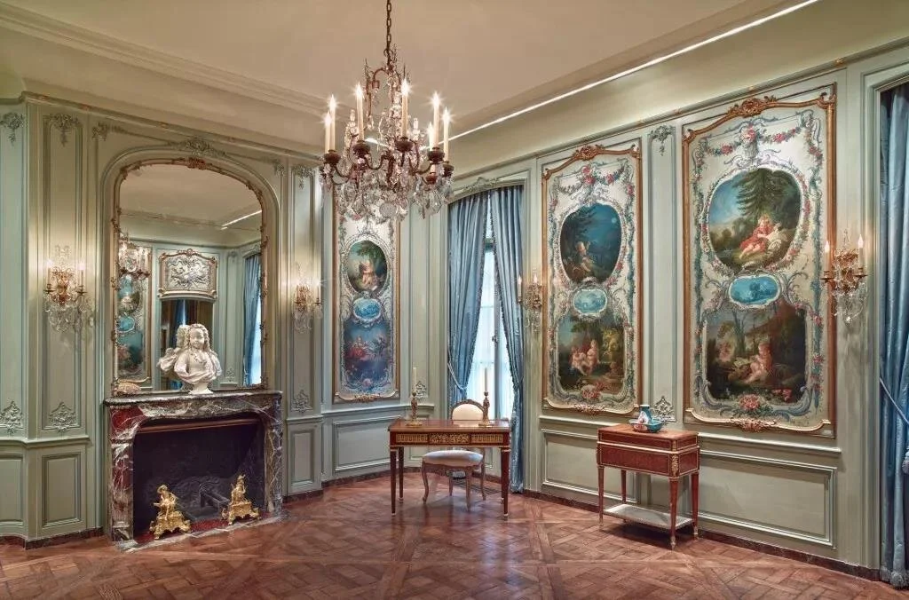 位于馆内一角的Boucher Room在淡蓝色的墙面上挂着八幅洛可可风油画,相传是为路易十五的情妇Mandame de Pompadour所做,画板由金边镶嵌,一串串娇艳的粉色玫瑰衬托着画布中央椭圆形的油画。画中的小童有的弹着竖琴,有的在读书,有的在嬉戏玩乐,有的在钓鱼狩猎。轻松活泼的氛围衬着房间青蓝色的背景,烘托出整个空间悠然典雅的氛围,与外厅庄严肃穆的物品陈列形成鲜明对比,使整个Frick Collection的层次丰富起来,突显了主人独特的品味与巧思。