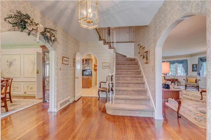 门厅宽阔大气,两边的欧式田园拱形架构将用餐区域以及客厅区域巧妙地划分开,布局对称,淡雅的花纹壁纸从一层的门厅区域延伸到二层走廊,突出空间设计的整体感。一进门对称考究的布局,以及清新典雅的设计,无不彰显了屋主对室内设计的别样用心。